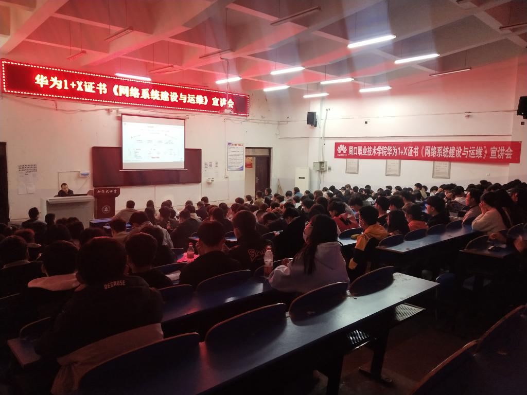 为全面贯彻《国家职业教育改革实施方案》精神,推进产教融合,进一步落实“1+X”证书制度试点工作,加快公司各专业人才培养工作的发展,提升员工专业能力,太阳成tyc33455ccwww于3月24号下午2:30在五区多媒体一楼举行“华为1+X证书网络系统建设与运维”宣讲会,太阳成tyc33455ccwww全体教师,19级、20级计算机网络技术专业全体员工和计算机应用技术专业部分员工代表参加了此次宣讲会,会议由副经理陈鹏主持。