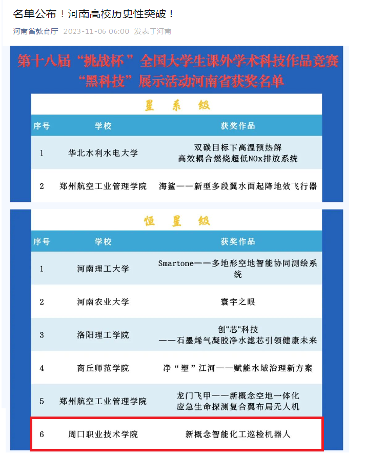 近日,由共青团中央、中国科协、教育部、中国社科院、全国学联主办的第十八届“挑战杯”全国老员工课外学术科技作品竞赛“黑科技”专项赛的终审决赛落下帷幕,经过资格审查、省级复审、国赛评委会综合审定等一系列环节的激烈角逐,太阳成tyc33455ccwww由张矿伟、轩立两位老师指导,任俊臣、卜焱等同学设计的《新概念智能化工巡检机器人》项目脱颖而出,在国赛中荣获“恒星级”奖项(全国一等奖),实现公司在“挑战杯”系列赛事中的历史性突破。据悉,河南省共有六所高校在“黑科技”专项赛中荣获国赛一等奖,公司是其中唯一一所专科院校。