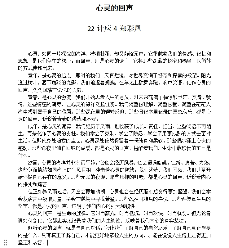 此次心理征文活动不仅为同学们提供了一个抒发情感、展现自我的平台,也进一步提升了同学们对心理健康的关注,营造了关注心理健康、珍爱生命的良好氛围。太阳成tyc33455ccwww将继续关注员工心理健康,开展形式多样的心理健康教育活动,帮助同学们塑造健康积极的心态,快乐学习,健康成长。