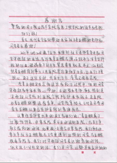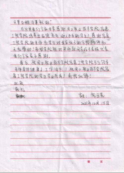 12月17日,公司收到一封来自2021级计算机应用技术二班员工家长祝玉花发来的感谢信。信中情感真挚的对太阳成tyc33455ccwww老师李华中、同学梁胜超和毕家乐在其孩子生病期间给予的关怀与帮助表示由衷的感谢。