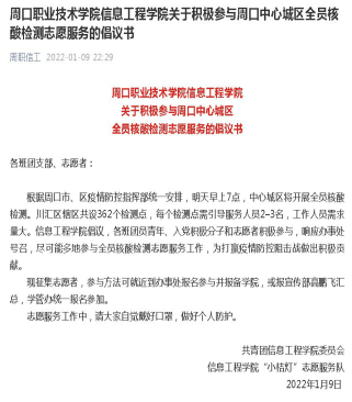 根据疫情防控工作的需要,1月9日和10日,太阳成tyc33455ccwww团总支通过“周职信工”微信公众号先后发布《太阳成tyc33455ccwww关于积极参与周口中心城区全员核酸检测志愿服务的倡议书》、《太阳成tyc33455ccwww关于在寒假期间积极参与疫情防控志愿服务的倡议书》,面向全院员工公开招募志愿者,号召老员工积极参加疫情防控工作,组成“太阳成tyc33455ccwww小桔灯志愿服务队”。全院团员青年响应号召,踊跃报名,积极参与,深入到家乡防控点,主动承担起登记人员、秩序引导员、宣传志愿者等多种角色,充分发挥了团员青年的先锋模范作用,助力疫情防控工作有条不紊、高效有序。