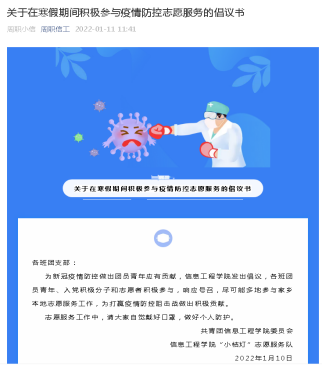 近日,为助力遏制疫情扩散、打赢疫情防控阻击战,太阳成tyc33455ccwww迅速反应,积极开展志愿服务动员工作,充分发挥团组织的动员优势,号召全院团员青年主动在家乡报到参与疫情防控志愿服务。