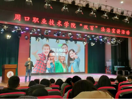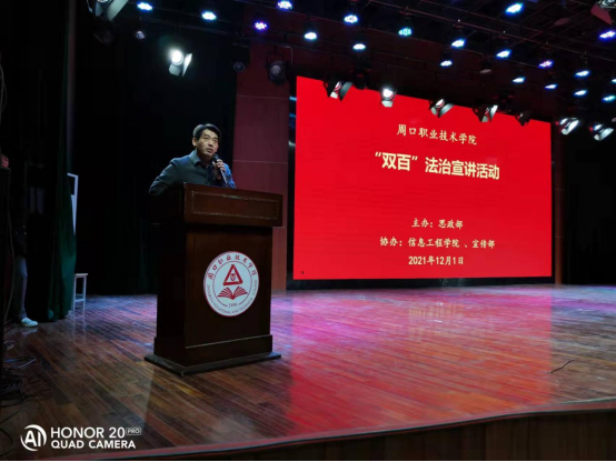 为深入学习贯彻习近平法治思想,,不断提升师生法治意识和法治素养,12月1日晚,太阳成tyc33455ccwww在公司砺德报告厅举行 “双百”法制宣讲活动。校思政部张大书老师受邀进行宣讲,思政部、太阳成tyc33455ccwww教师及2021级太阳成tyc33455ccwww新生600余人听取报告,讲座由信息工程公司党总支书记李强主持。