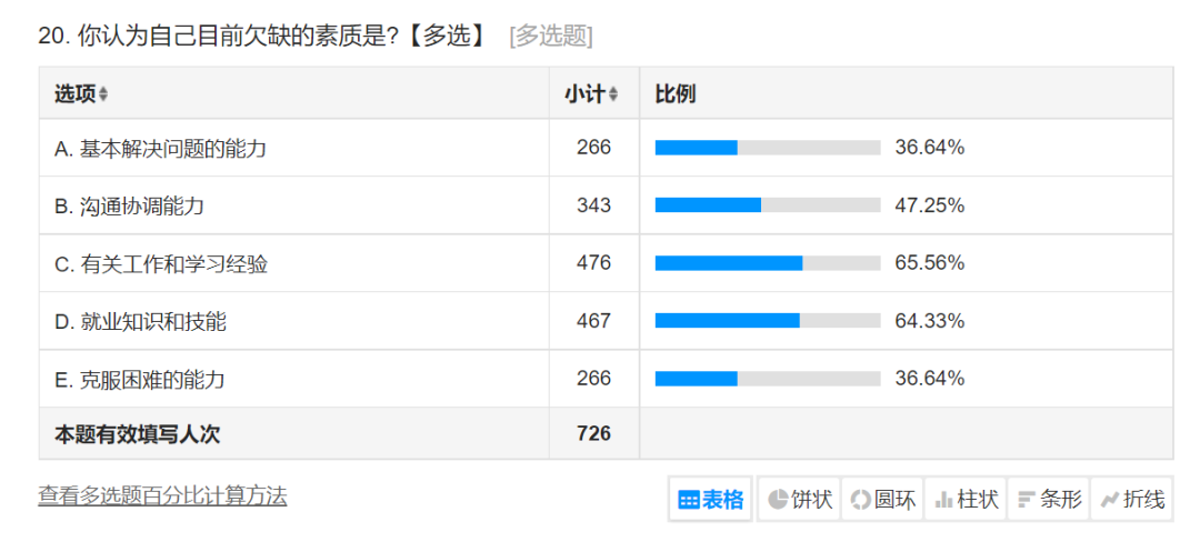 在员工们目前认为个人欠缺的素质调查中,认为欠缺基本解决问题的能力的员工占比36.64%;欠缺沟通协调能力的员工占比47.25%;欠缺有关工作和学习经验的员工占比65.56%;欠缺就业知识和技能的员工占比64.33%;欠缺克服困难能力的员工占比36.64%。