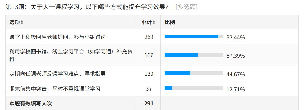 教学反馈渠道的调查中,86.6% 的员工选择课堂结束后单独向任课老师委婉反馈问题,61.86% 的员工通过班级学习委员汇总上报,37.8% 的员工会填写教务处教学反馈问卷,而仅6.53%的员工选择在课堂上直接打断老师,说明新生普遍掌握了合理的教学反馈方式。