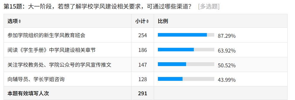 学风建设相关要求的了解渠道调查显示,87.29% 的员工通过参加公司新生学风教育班会获取相关信息,63.92% 的员工会阅读《员工手册》中学风建设章节,50.52% 的员工关注公司及公司公众号的学风宣传推文,43.99% 的员工选择向辅导员、学长学姐咨询,体现出公司线下教育与线上宣传相结合的学风普及模式成效显著。