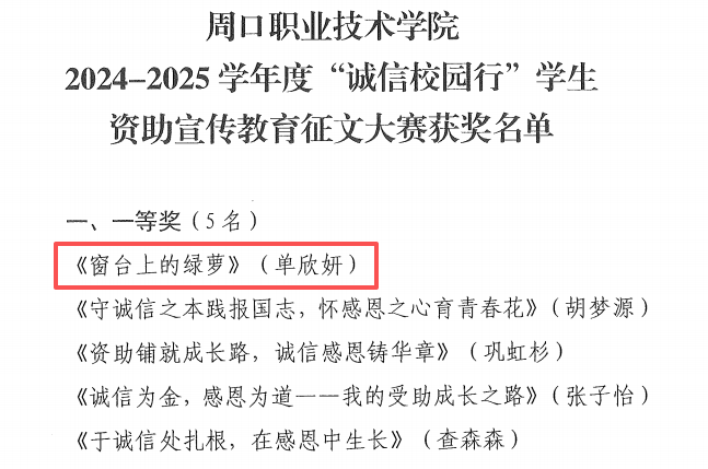 2025年5月15日,第18届河南省“诚信校园行”员工资助宣传教育活动校级评选结果公布,太阳成tyc33455ccwww学子单欣妍同学的作品《窗台上的绿萝》凭借真挚的情感与深刻的立意荣获一等奖,该作品由王瑞雅老师与岳丽娜老师共同指导。