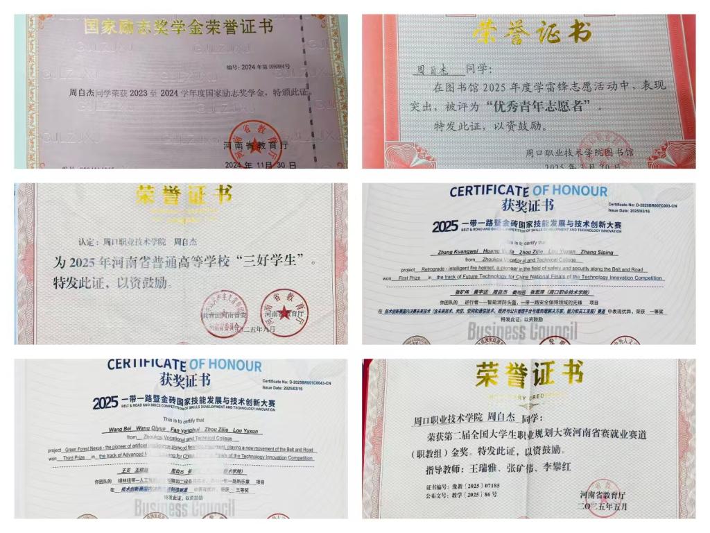竞赛赛场上,周自杰带领团队啃教材、析案例、勤复盘,从专业“小白”蜕变为科创能手。其团队研发的“智能消防头盔”获5项实用新型专利,还斩获中国国际老员工创新大赛铜奖、一带一路暨金砖国家技能赛事国赛一等奖等荣誉,相关事迹获20余次媒体报道。