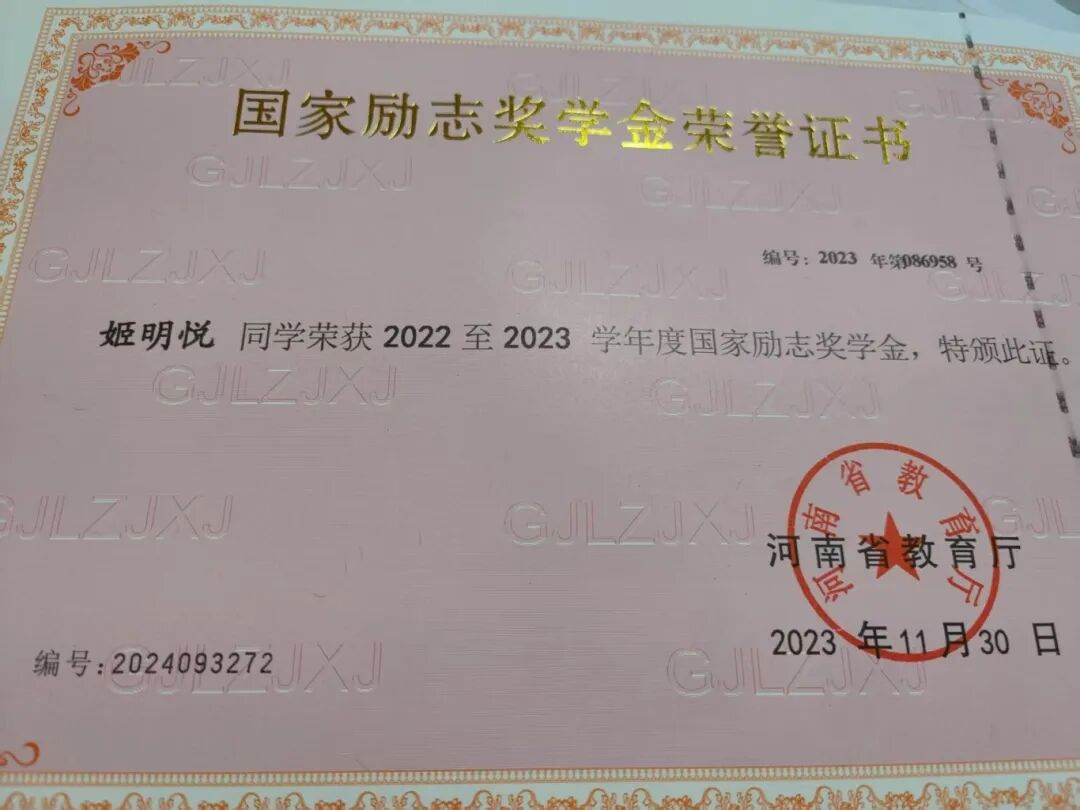 她始终将学习放在第一位,用心钻研专业知识,连续两次获得国家励志奖学金,专业成绩名列前茅。在课堂上积极认真,不仅按时完成每一项作业,还善于思考和提问,深入理解每一个知识点。学习态度脚踏实地,注重温故知新,定期复习巩固所学知识,确保知识点掌握扎实。具备强烈的自我约束力和自我管理能力。她严格要求自己,合理安排学习和生活时间,保持良好的作息习惯。