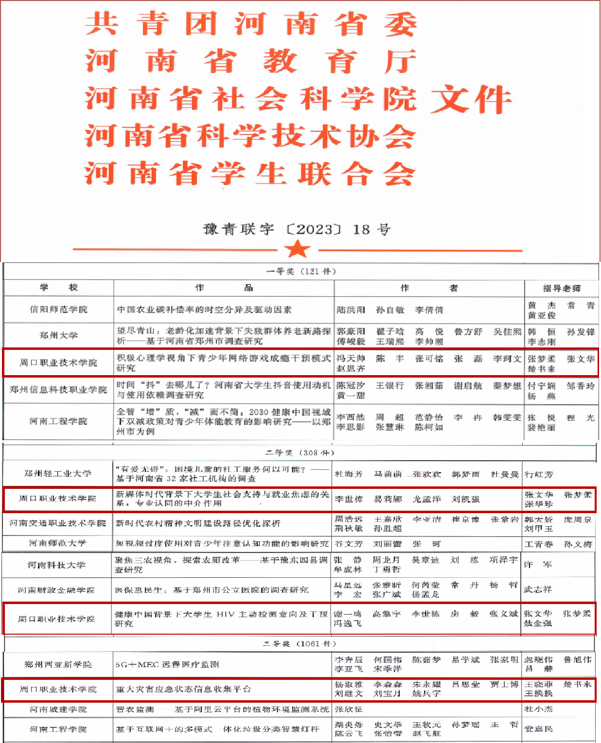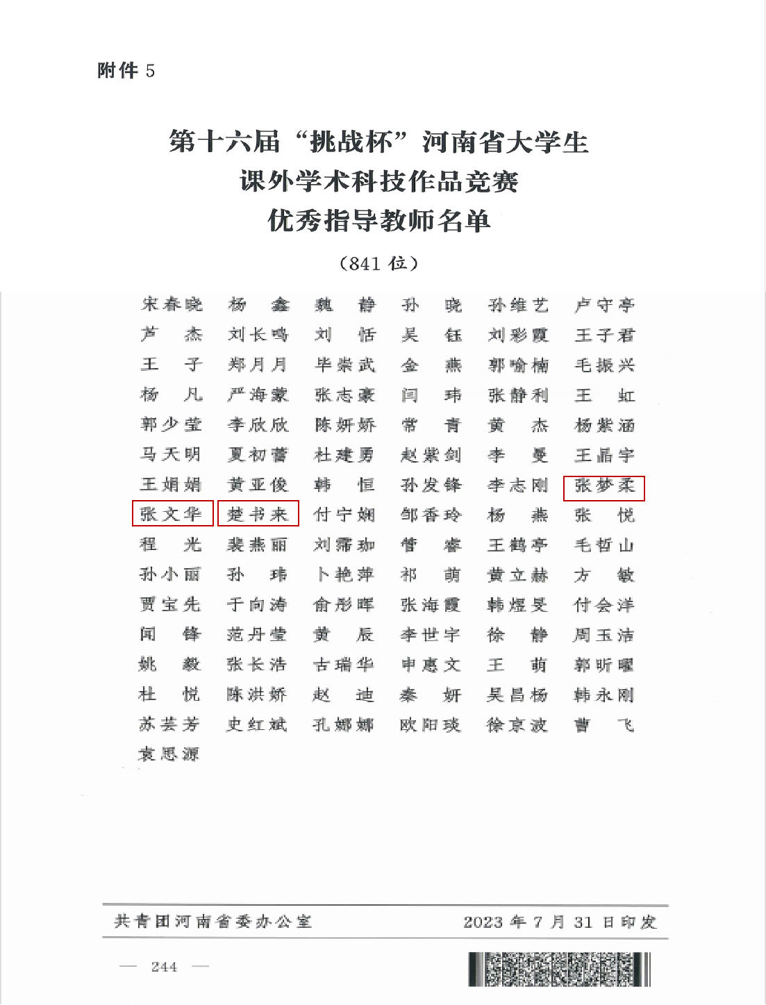 近日,由共青团河南省委、省教育厅、省社会科公司、省科学技术协会、省学联共同主办的第十六届“挑战杯”河南省老员工课外学术科技作品竞赛圆满结束。自接到大赛通知以来,太阳成tyc33455ccwww高度重视、积极宣传、广泛发动,最终喜获一等奖1项、二等奖2项、三等奖1项,张梦柔、张文华、楚书来三位老师被评为优秀指导老师,获奖数量创历史新高。